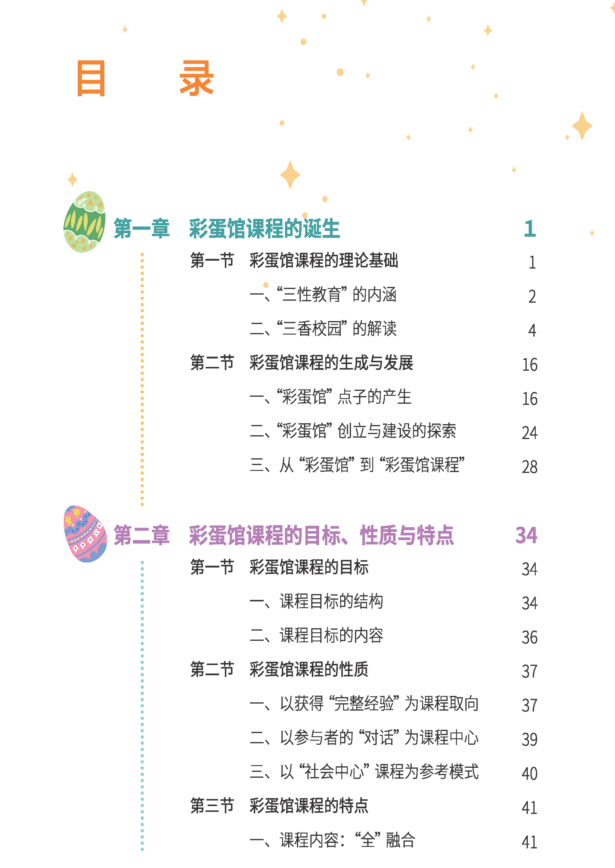 全书共五章,分为三个部分:第一部分包括第一章,主要回顾彩蛋馆课程从理论走向实践的过程,这部分内容也是幼儿园博物馆系列课程的基本理念在“彩蛋馆课程”落地生根的体现。第二部分包括第二章至第四章,介绍了彩蛋馆课程的目标、组织实施以及具体内容等要素的实践样态。第四章是彩蛋馆课程的实录精选。第三部分包括第五章,主要是对彩蛋馆课程的评价体系进行梳理。