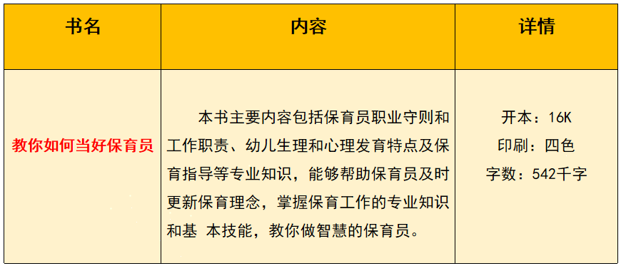 本书以《保育员国家职业技能标准》为编写依据,主要内容包括保育员职业守则和工作职责、幼儿生理和心理发育特点及指导、幼儿健康观察与管理、幼儿园卫生与消毒管理、幼儿园常见传染病防控、幼儿意外伤害现场急救等专业知识,能够帮助保育员及时更新保育理念,掌握保育工作的专业知识和基本技能,提升保育工作的质量和水平。