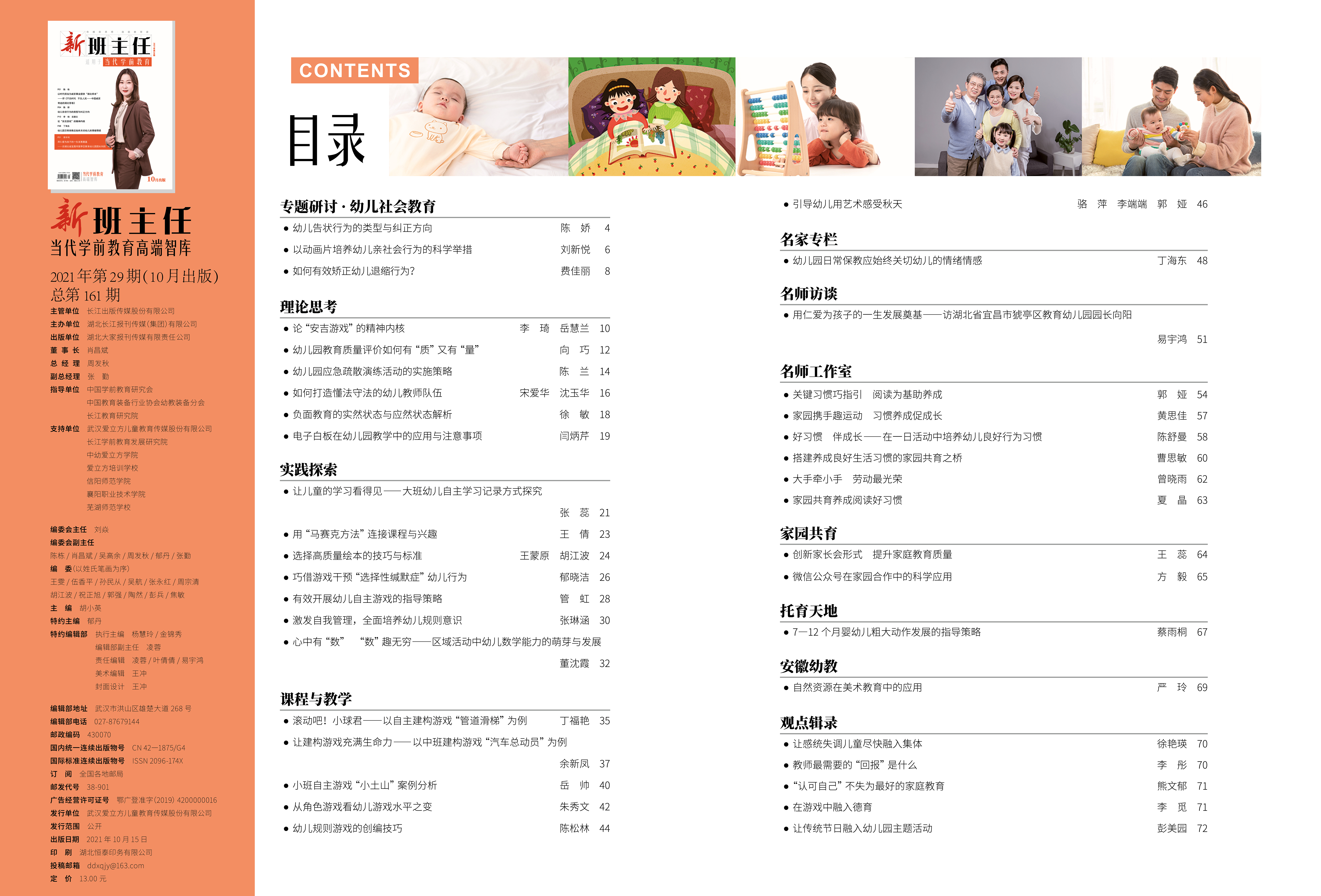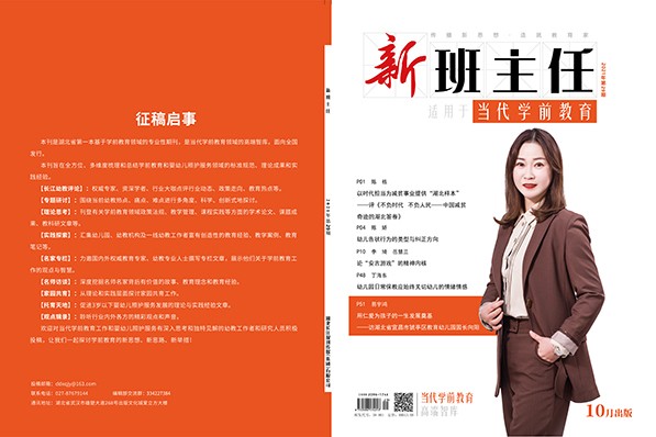 P01 陈 栋 以时代担当为减贫事业提供“湖北样本” ——评《不负时代 不负人民——中国减贫奇迹的湖北答卷》 P04 陈 娇 幼儿告状行为的类型与纠正方向 P10 李 琦 岳慧兰 论“安吉游戏”的精神内核 P48 丁海东 幼儿园日常保教应始终关切幼儿的情绪情感 P51 易宇鸿 用仁爱为孩子的一生发展奠基 ——访湖北省宜昌市猇亭区教育幼儿园园长向阳