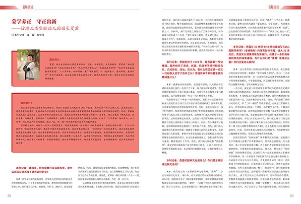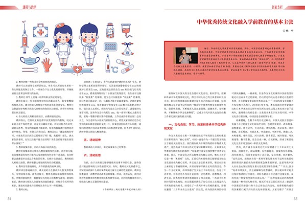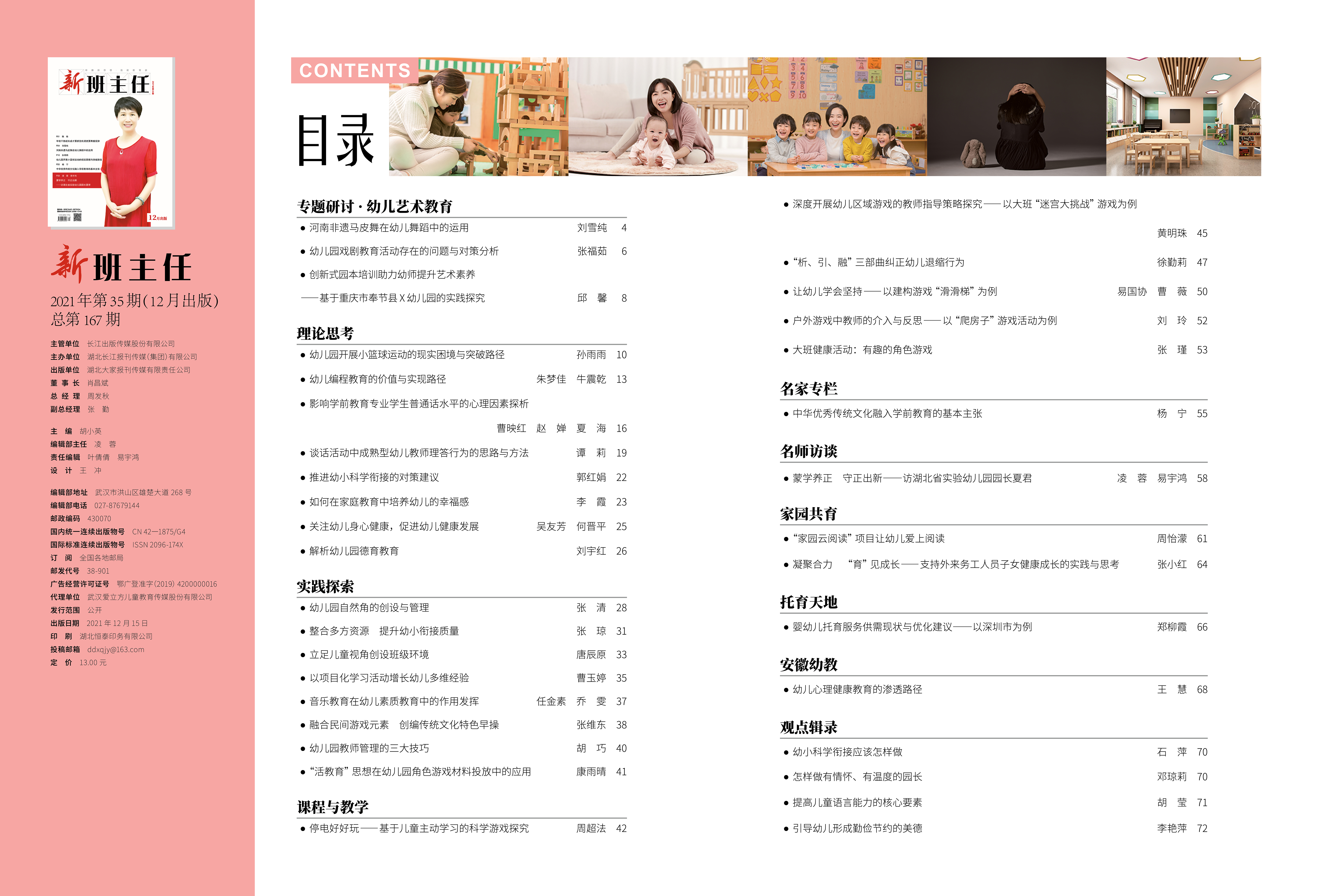 P01 陈 栋 年轻干部成长成才要抓住机遇更要尊重规律 P04 刘雪纯 河南非遗马皮舞在幼儿舞蹈中的运用 P10 孙雨雨 幼儿园开展小篮球运动的现实困境与突破路径 P55 杨 宁 中华优秀传统文化融入学前教育的基本主张 P58 凌 蓉 易宇鸿 蒙学养正 守正出新 ——访湖北省实验幼儿园园长夏君