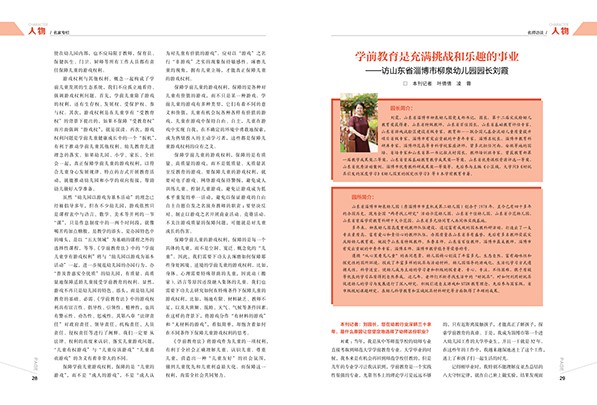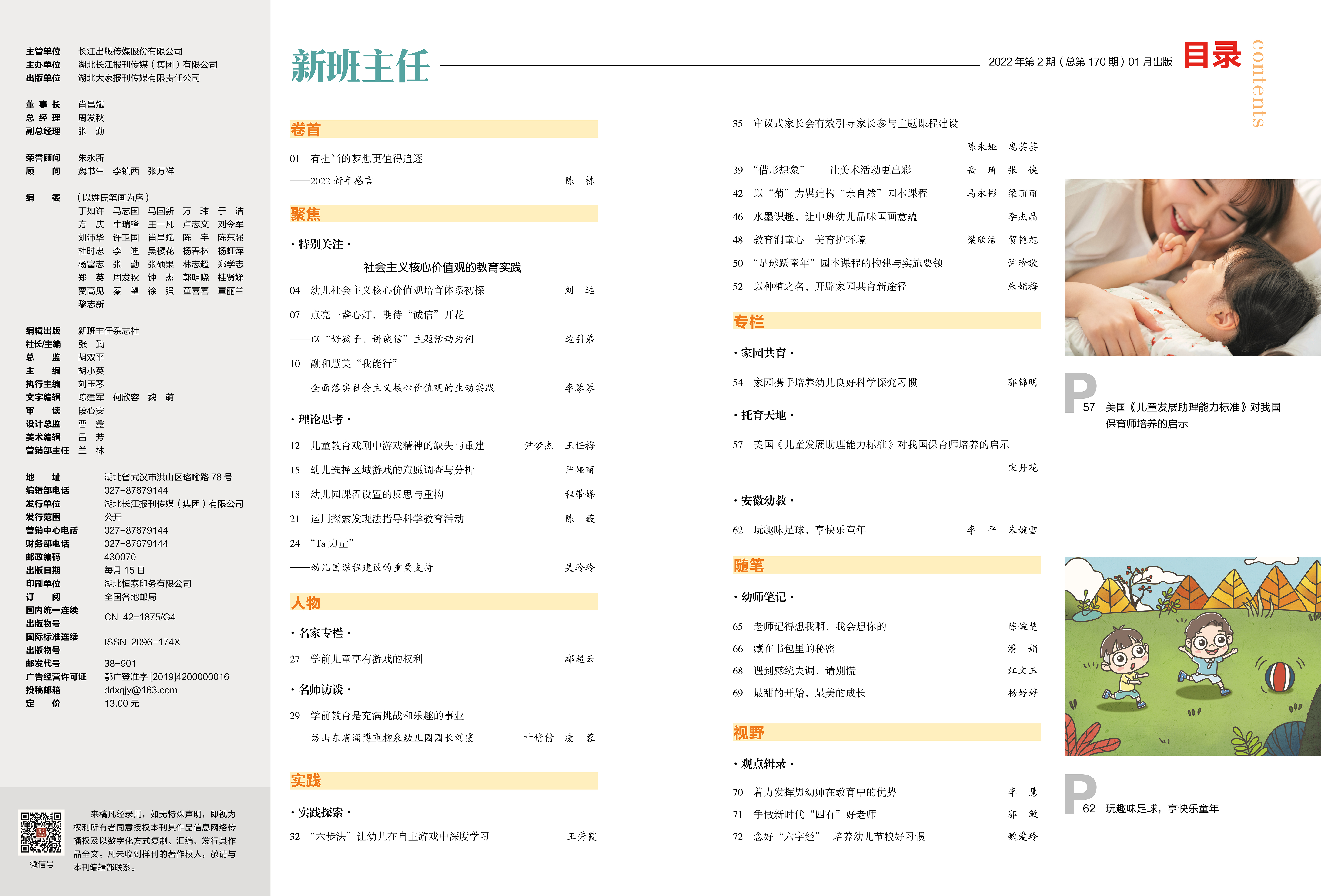 P01 陈 栋 有担当的梦想更值得追逐 ——2022新年感言 P12 尹梦杰 王任梅 儿童教育戏剧中游戏精神的缺失与重建 P27 鄢超云 学前儿童享有游戏的权利 P29 叶倩倩 凌 蓉 学前教育是充满挑战和乐趣的事业 ——访山东省淄博市柳泉幼儿园园长刘霞 P32 王秀霞 “六步法”让幼儿在自主游戏中深度学习