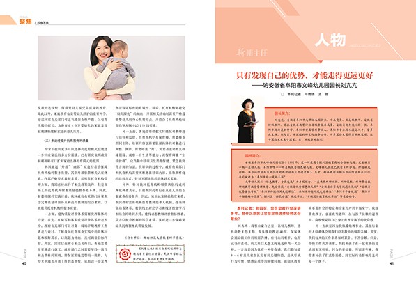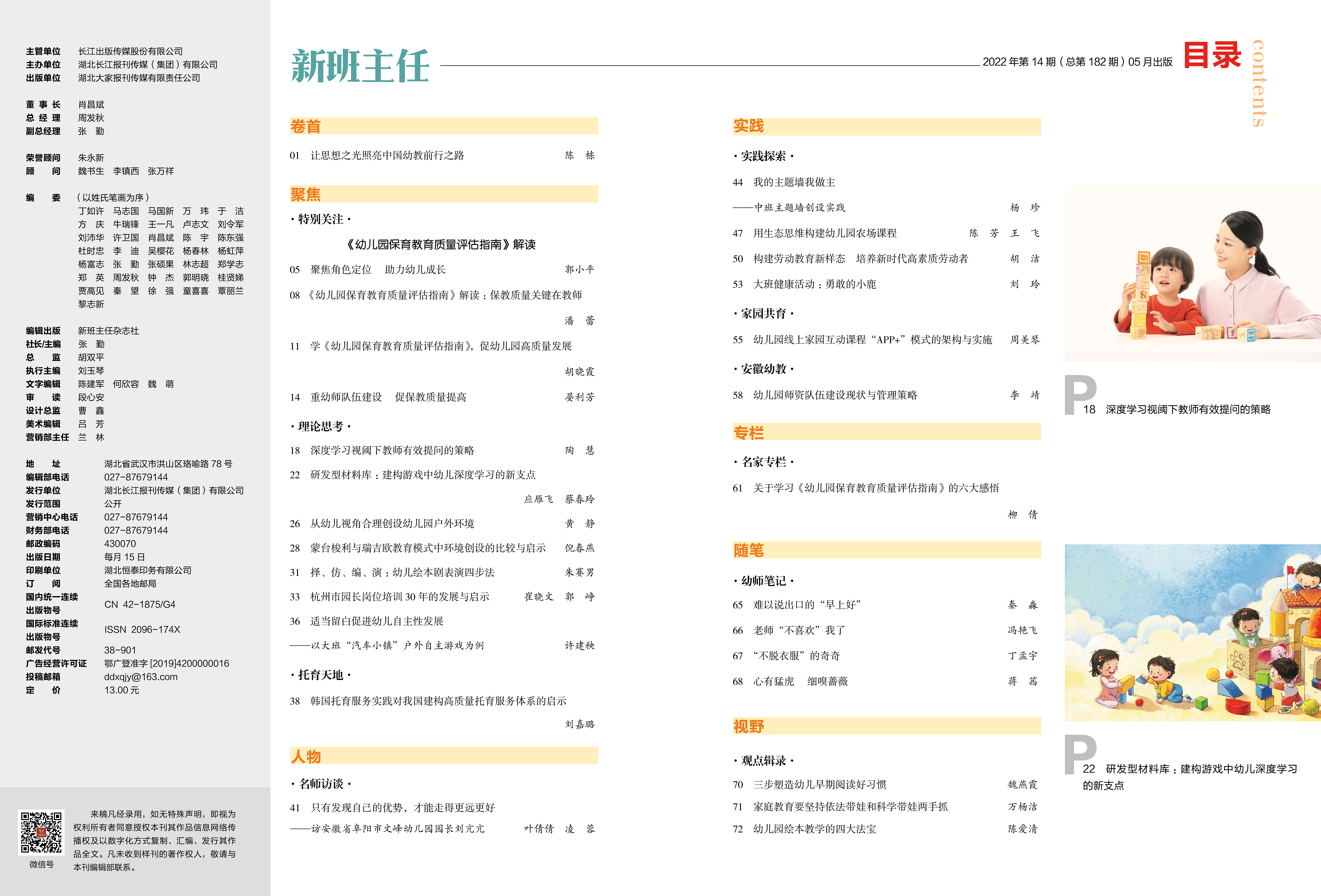 P01 陈 栋 让思想之光照亮幼教前行之路 P18 陶 慧 深度学习视阈下教师有效提问的策略 P41 凌 蓉 叶倩倩 只有发现自己的优势,才能走得更远更好 ——访安徽省阜阳市文峰幼儿园园长刘亢亢 P44 杨 珍 我的主题墙我做主 ——中班主题墙创设实践 P61 柳 倩 关于学习《幼儿园保育教育质量评估指南》的六大感悟