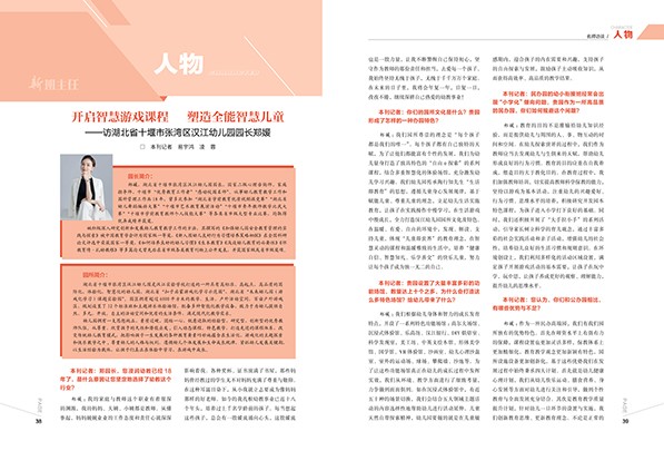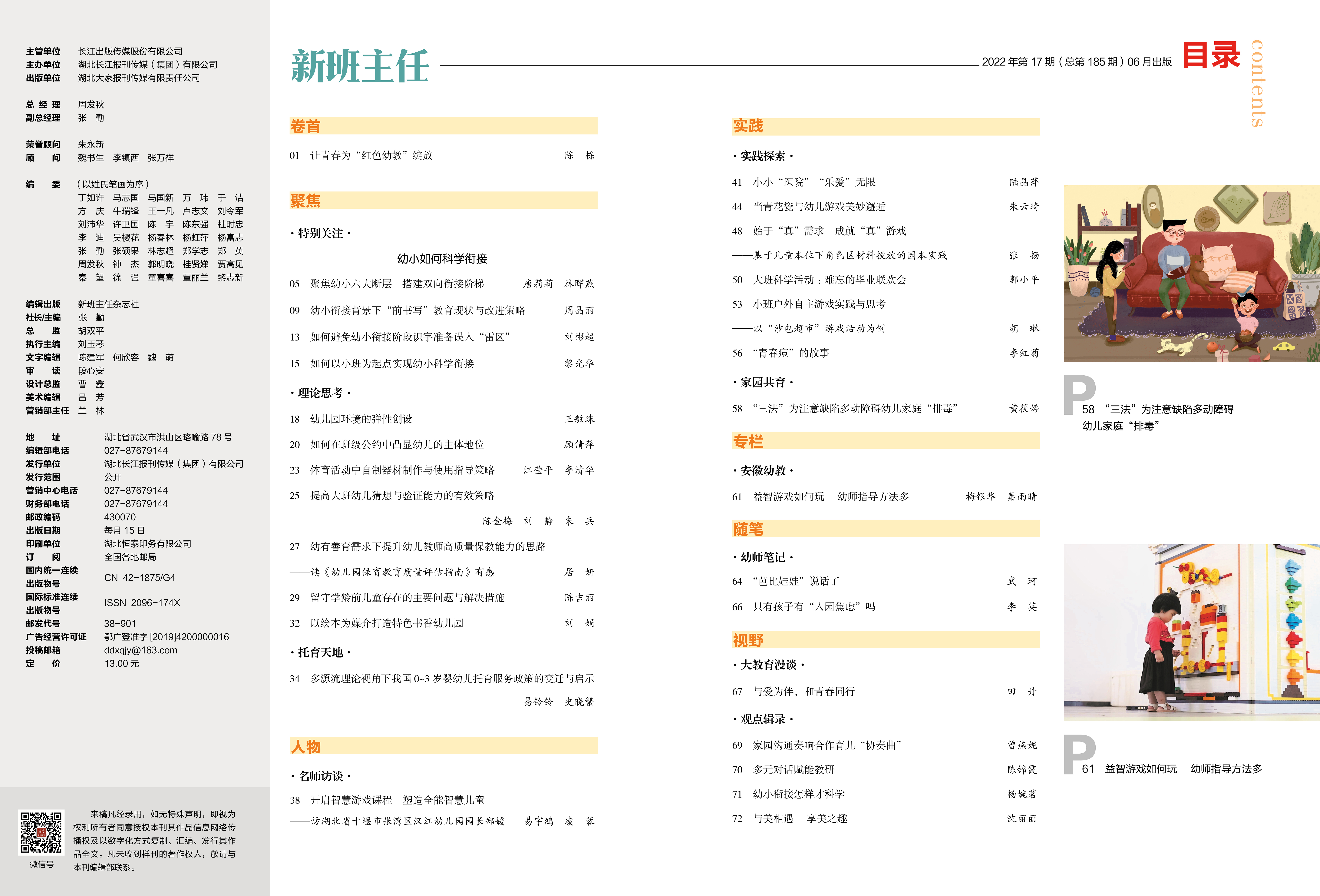 P01 陈 栋 让青春为“红色幼教”绽放 P05 唐莉莉 林晖燕 聚焦幼小六大断层 搭建双向衔接阶梯 P38 凌 蓉 易宇鸿 开启智慧游戏课程 塑造全能智慧儿童 ——访湖北省十堰市张湾区汉江幼儿园园长郑媛 P41 陆晶萍 小小“医院” “乐爱”无限 P66 李 英 只有孩子有“入园焦虑”吗