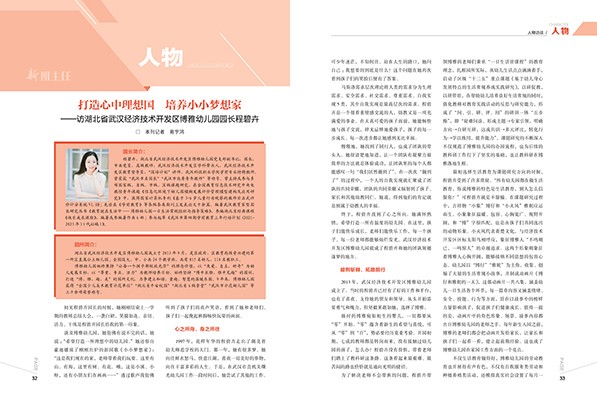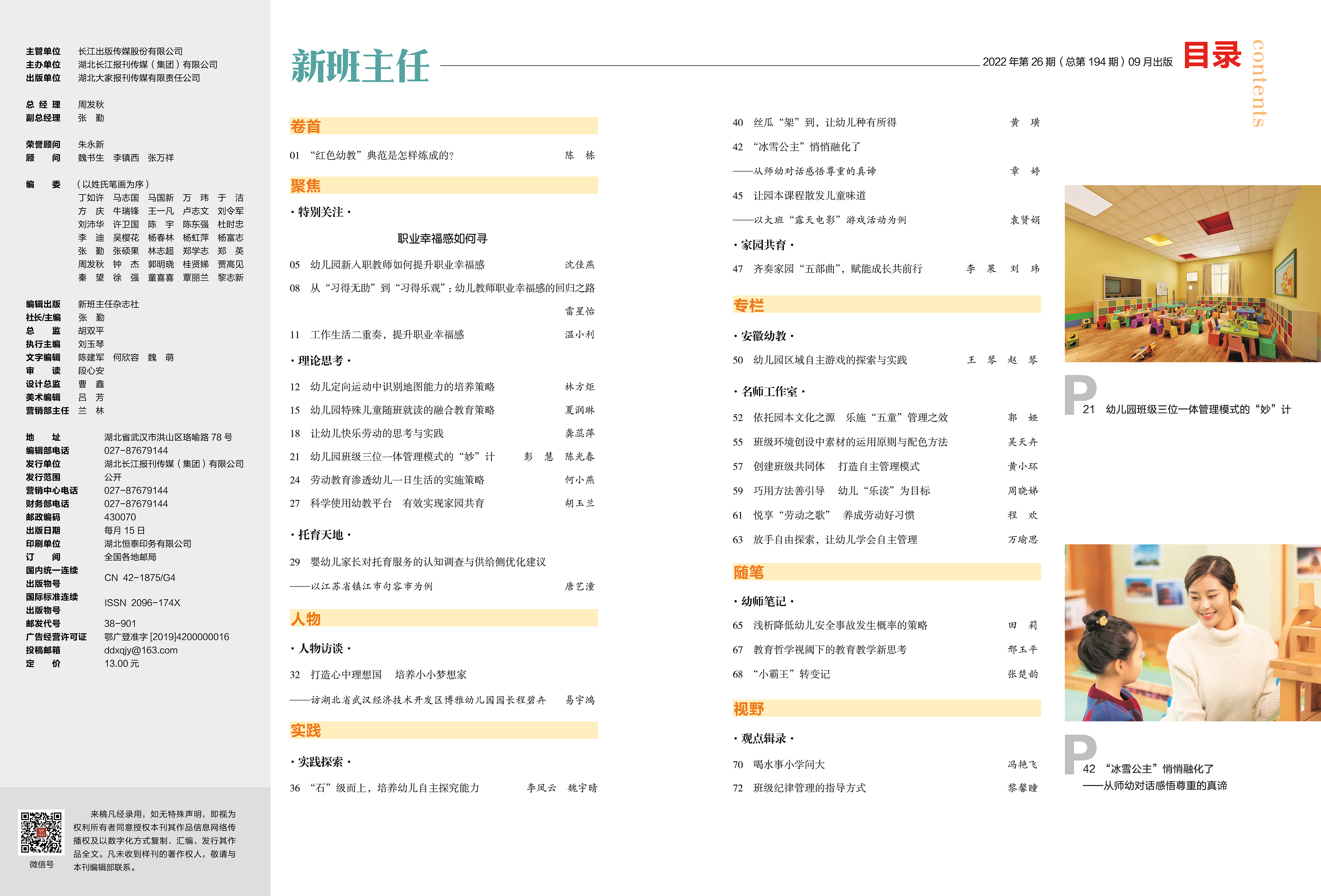 P01 陈 栋 “红色幼教”典范是怎样炼成的? P05 沈佳燕 幼儿园新入职教师如何提升职业幸福感 P12 林方炬 幼儿定向运动中识别地图能力的培养策略 P32 易宇鸿 打造心中理想国 培养小小梦想家 ——访湖北省武汉经济技术开发区博雅幼儿园园长程碧卉 P36 李凤云 魏宇晴 “石”级而上,培养幼儿自主探究能力