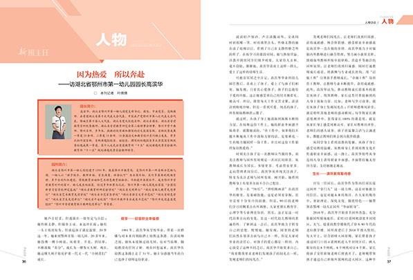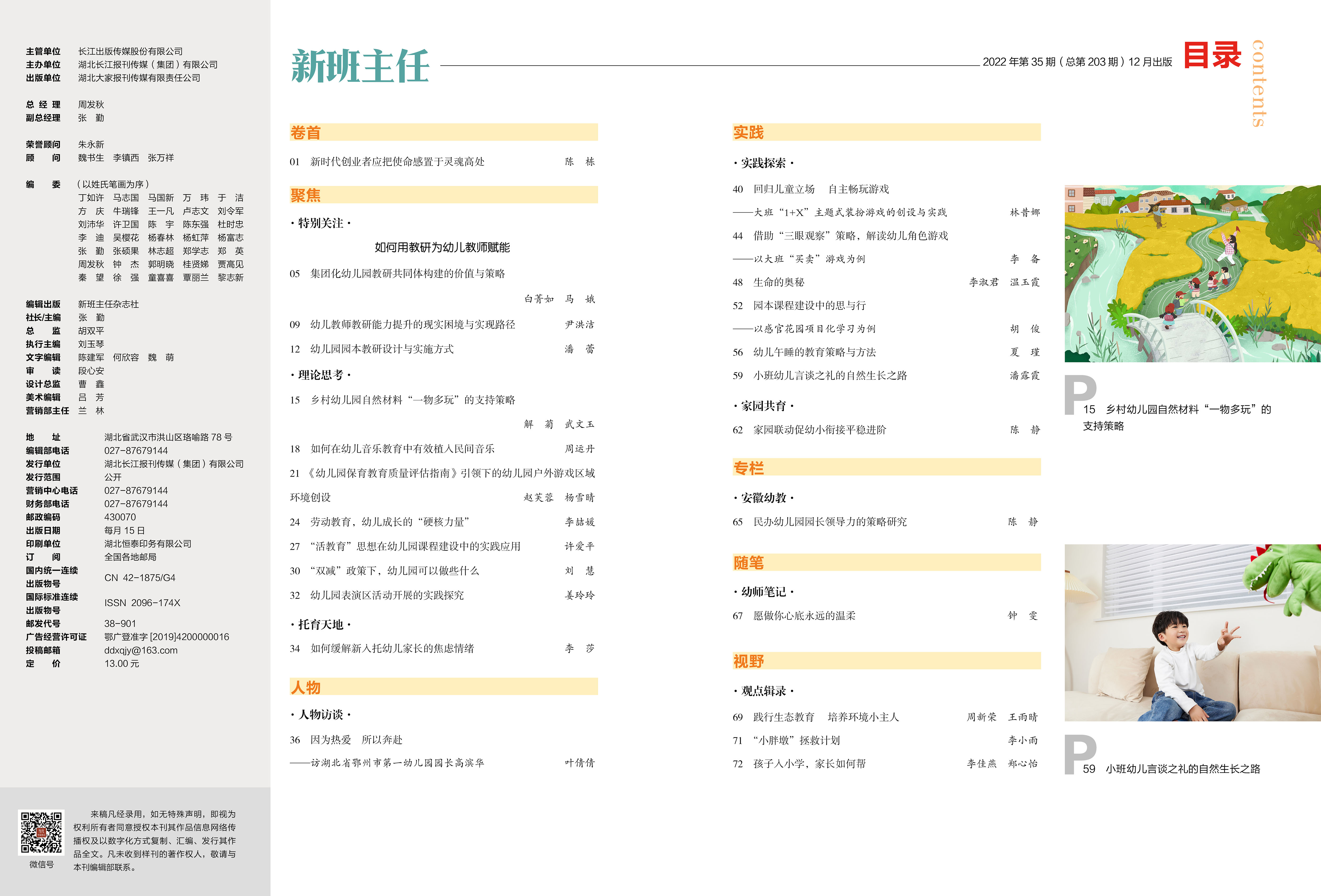 P01 陈 栋 新时代创业者应把使命感置于灵魂高处 P05 白菁如 马娥 集团化幼儿园教研共同体构建的价值与策略 P15 解菊 武文玉 乡村幼儿园自然材料“一物多玩”的支持策略 P36 叶倩倩 因为热爱 所以奔赴 ——访湖北省鄂州市第一幼儿园园长高滨华 P65 陈静 民办幼儿园园长领导力的策略研究