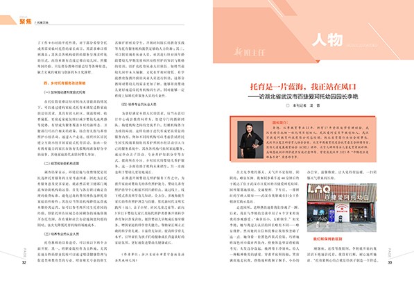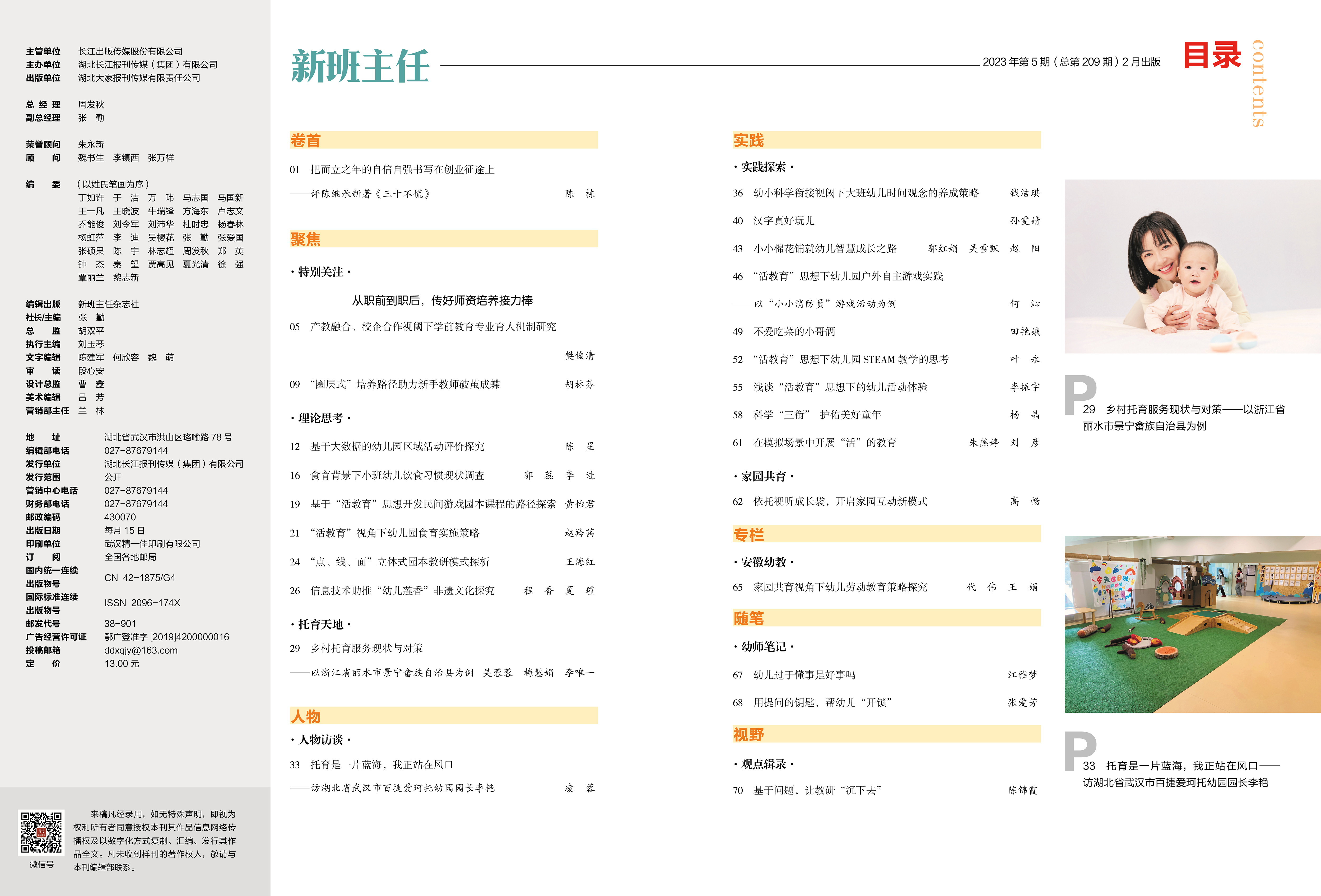 P01 陈 栋 把而立之年的自信自强书写在创业征途上 ——读陈继承新著《三十不慌》 P05 樊俊清 产教融合、校企合作视阈下学前教育专业育人机制研究 P12 陈星 基于大数据的幼儿园区域活动评价探究 P26 凌蓉 托育是一片蓝海,我正站在风口 ——访湖北省武汉市百捷爱珂托幼园园长李艳 P67 江雅梦 幼儿过于懂事是好事吗
