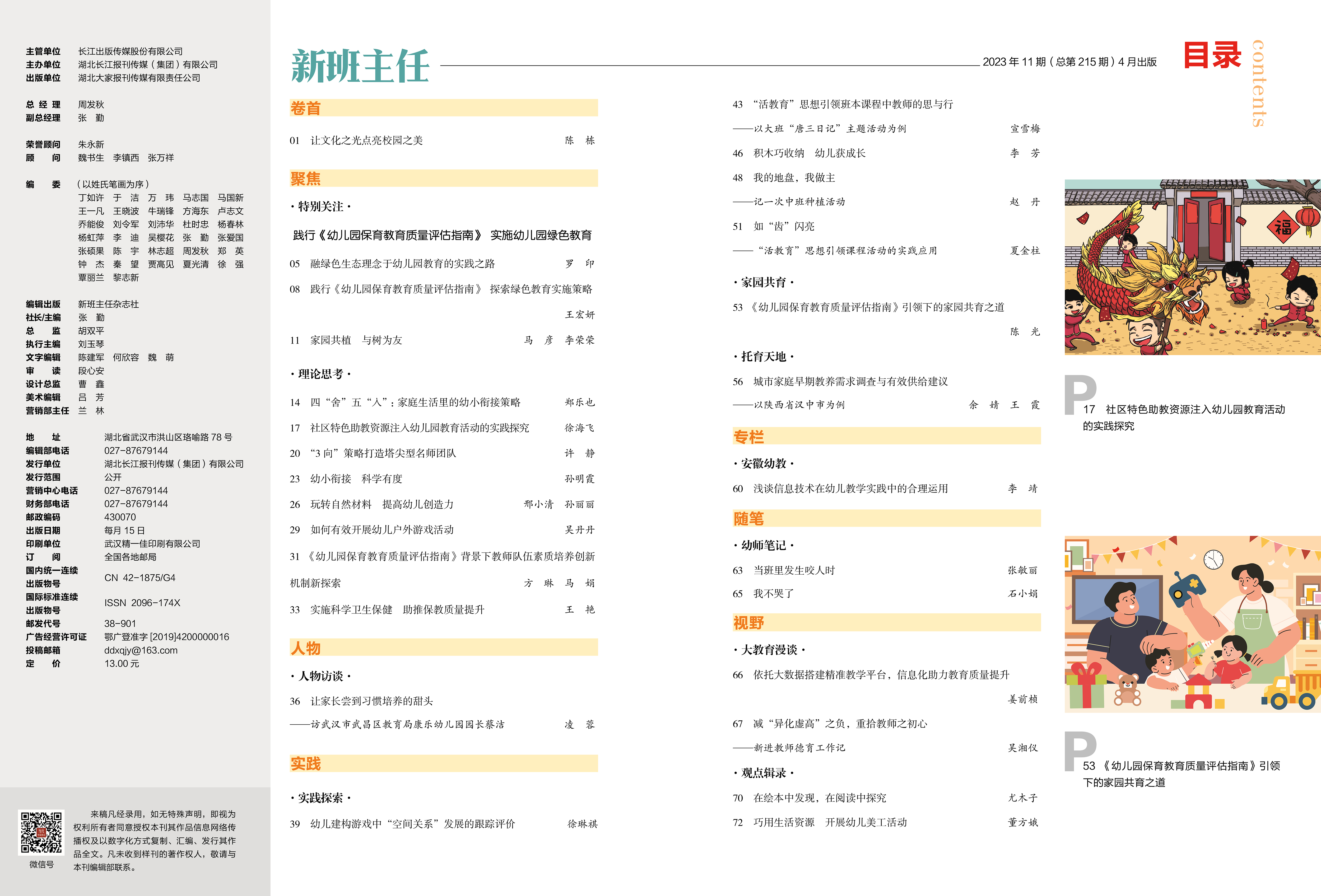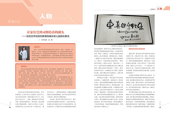 P01 陈 栋 让文化之光点亮校园之美 P05 罗印 融绿色生态理念于幼儿园教育的实践之路 P14 郑乐也 四“舍”五“入”:家庭生活里的幼小衔接策略 P36 凌蓉 让家长尝到习惯培养的甜头 ——访武汉市武昌区教育局康乐幼儿园园长蔡洁 P63 张敏丽 当班里发生咬人时