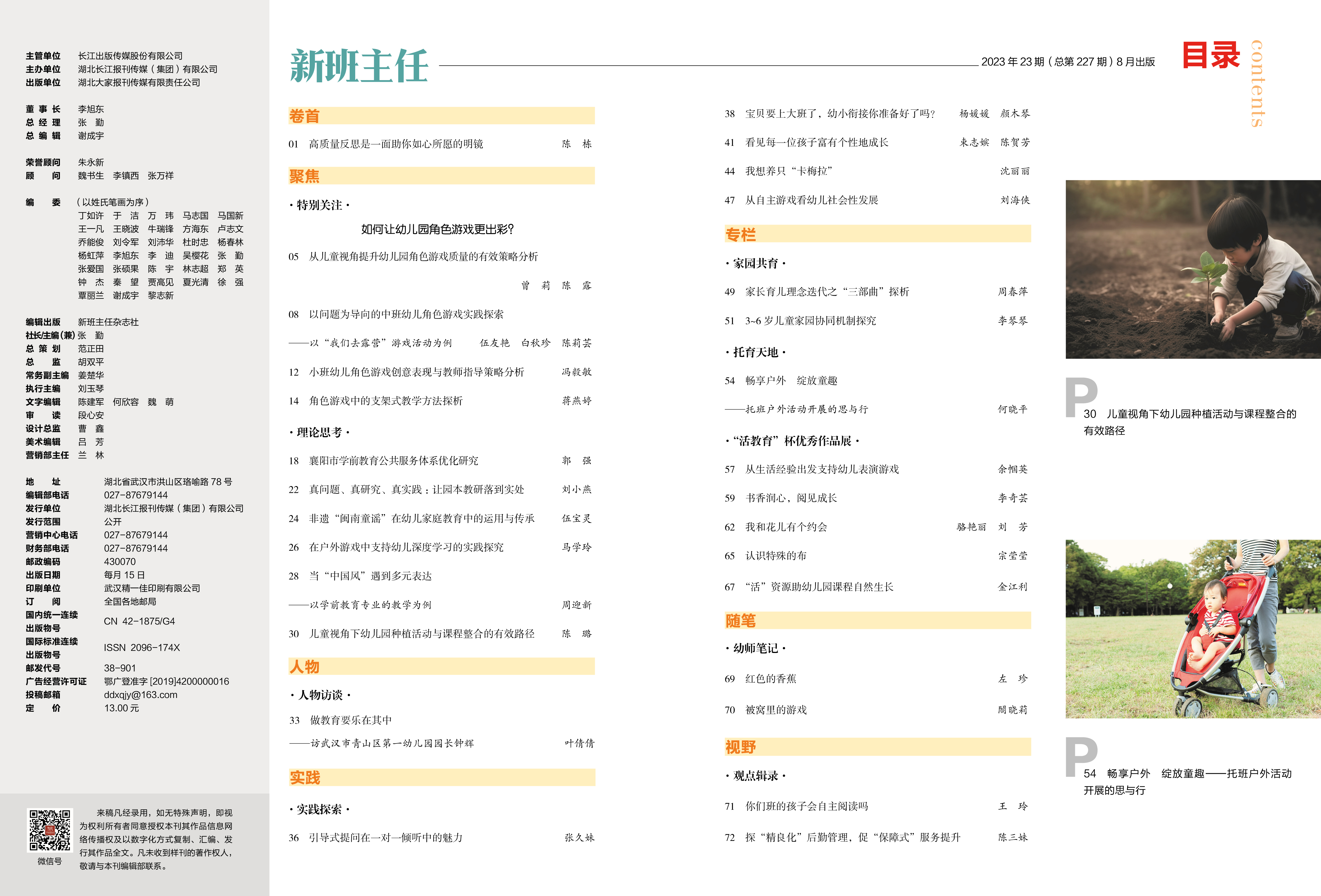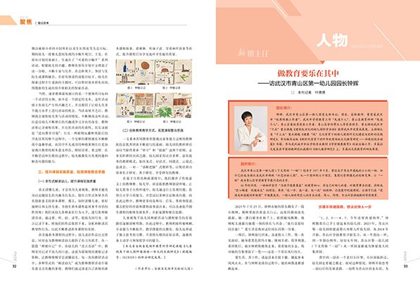 P01 陈 栋 高质量反思是一面助你如心所愿的明镜 P05 曾 莉 陈 露 从儿童视角提升幼儿园角色游戏质量的有效策略分析 P18 郭 强 襄阳市学前教育公共服务体系优化研究 P33 叶倩倩 做教育要乐在其中 ——访武汉市青山区第一幼儿园园长钟辉 P69 左 珍 红色的香蕉
