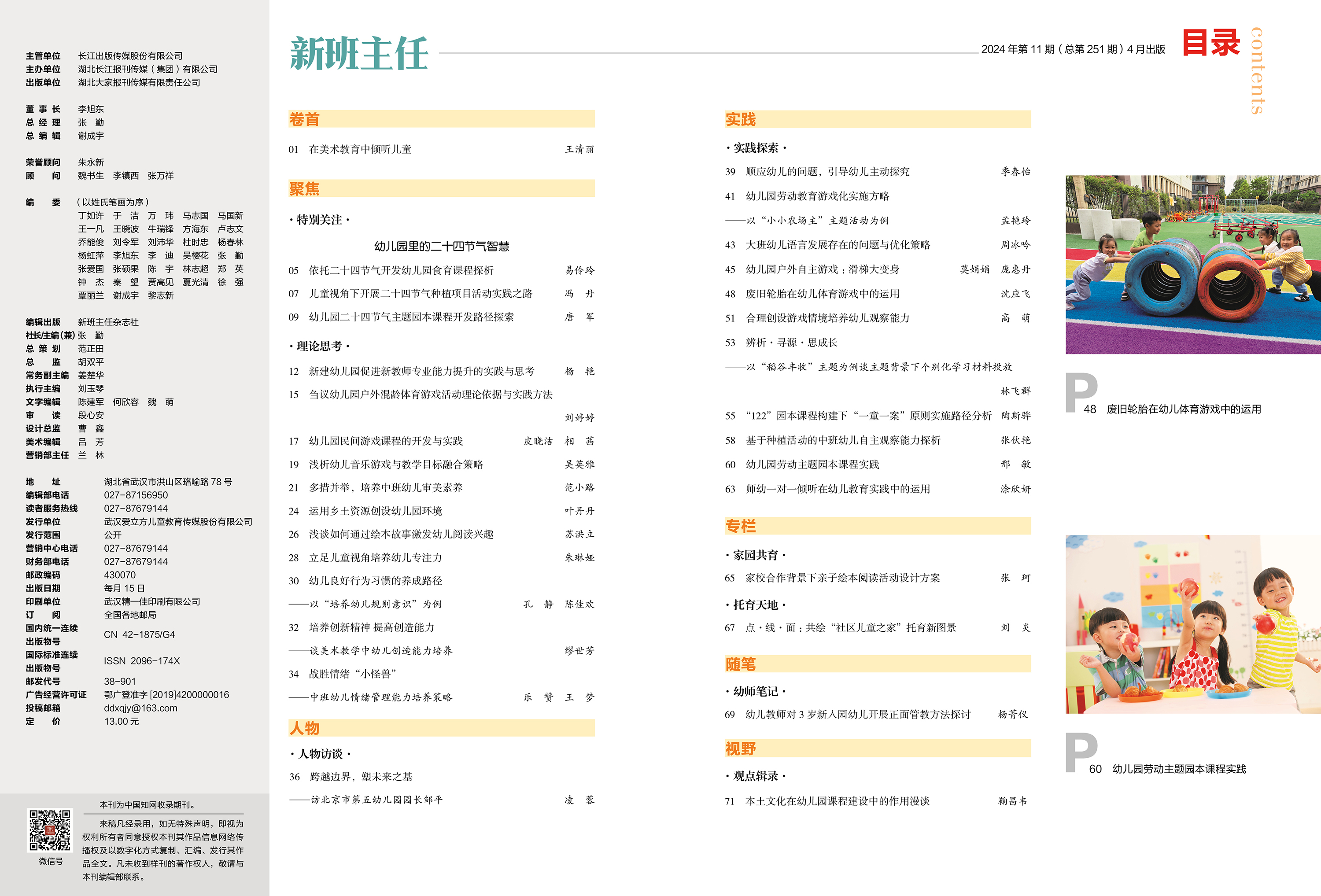 P01 王清丽 在美术教育中倾听儿童 P05 易伶玲 依托二十四节气开发幼儿园食育课程探析 P12 杨 艳 新建幼儿园促进新教师专业能力提升实践与思考 P36 凌 蓉 跨越边界,塑未来之基 ——访北京市第五幼儿园园长邹平 P39 季春怡 顺应问题,引导幼儿主动探究