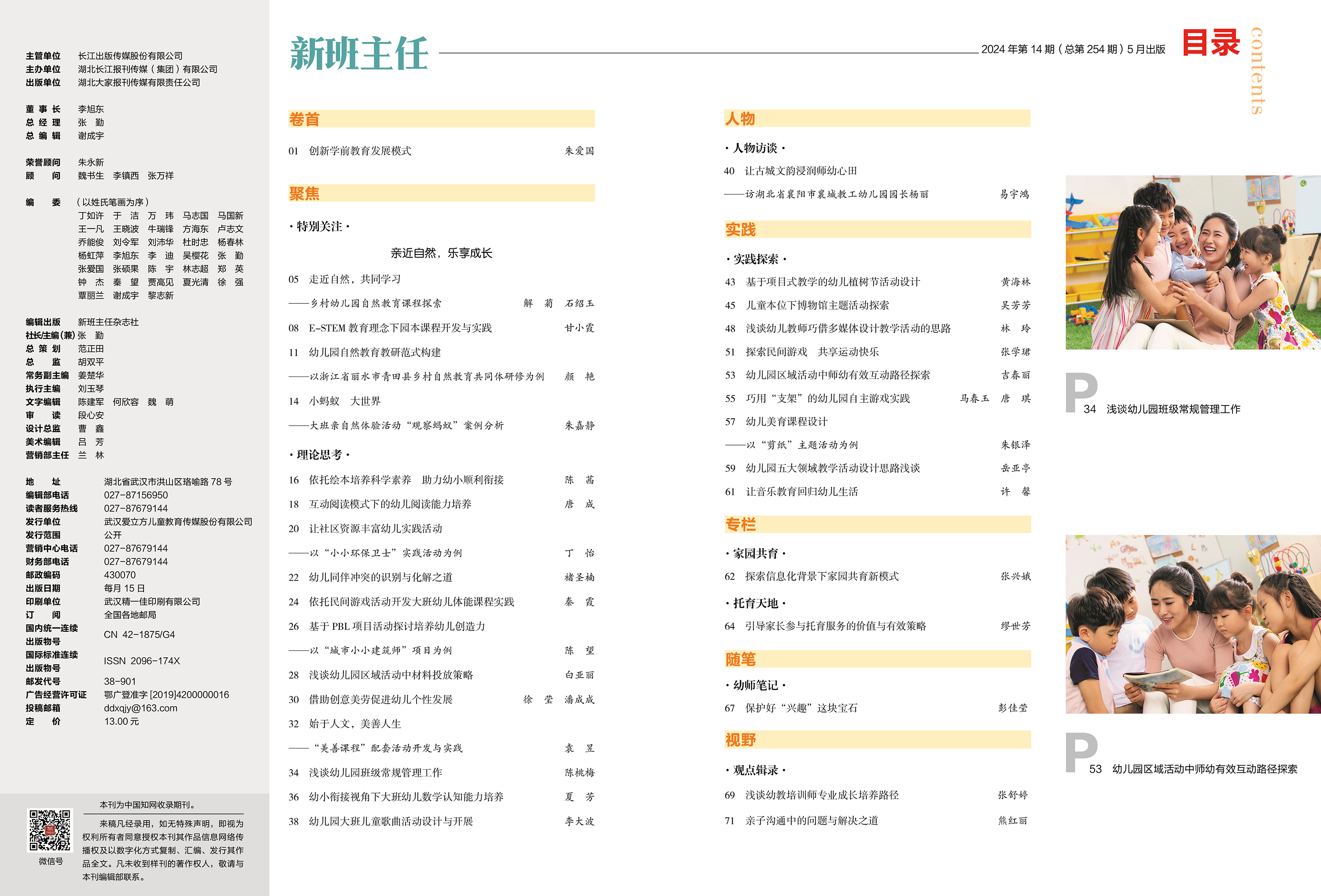 P01 朱爱国 创新学前教育发展模式 P05 解 菊 石绍玉 走近自然,共同学习 ——乡村幼儿园自然教育课程探索 P16 陈 茜 依托绘本培养科学素养 助力幼小顺利衔接 P40 易宇鸿 让古城文韵浸润师幼心田 ——访湖北省襄阳市襄城教工幼儿园园长杨丽 P43 黄海林 基于项目式教学的幼儿植树节活动设计